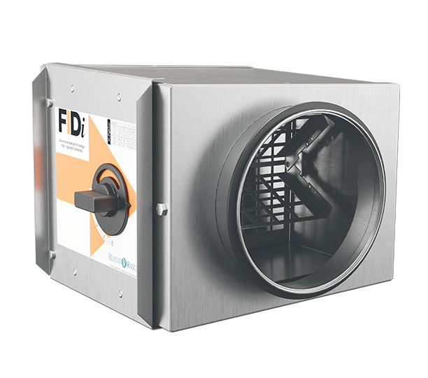 FIDi is a self-acting back draught damper designed to prevent the spread of combustion gas via the intake air system in ventilation systems. FIDi is equipped with measurement and commissioning functions, thus it can also be used as a adjustment damper.