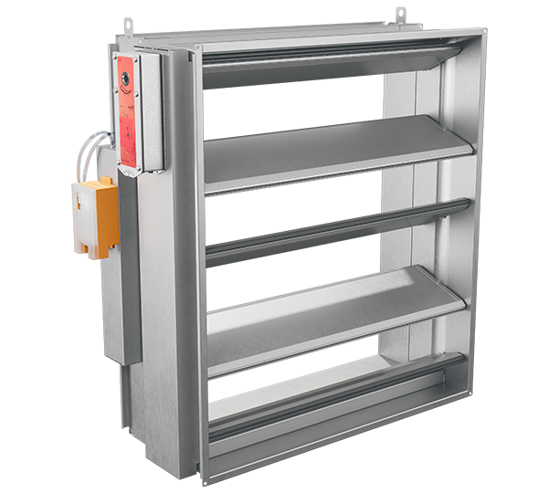CE-marked smoke damper designed to prevent the spread of smoke at the ventilation duct’s penetration of fire classified walls/joist systems or for placement after air handling units that serve more than one fire compartment.